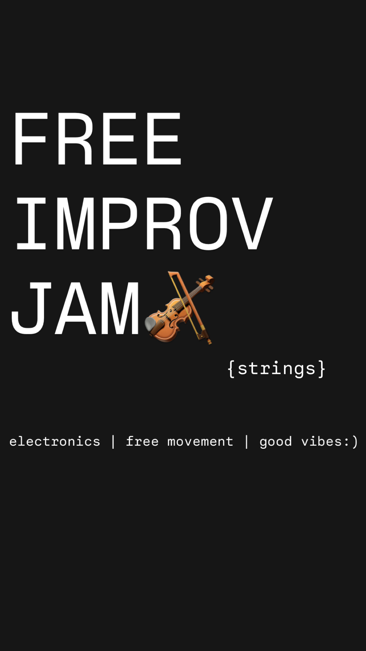 Free improvisation session for string players🎻bring pedals/electronics if you’d like. Free movers (dance, etc.) and other instrumentalists also welcome