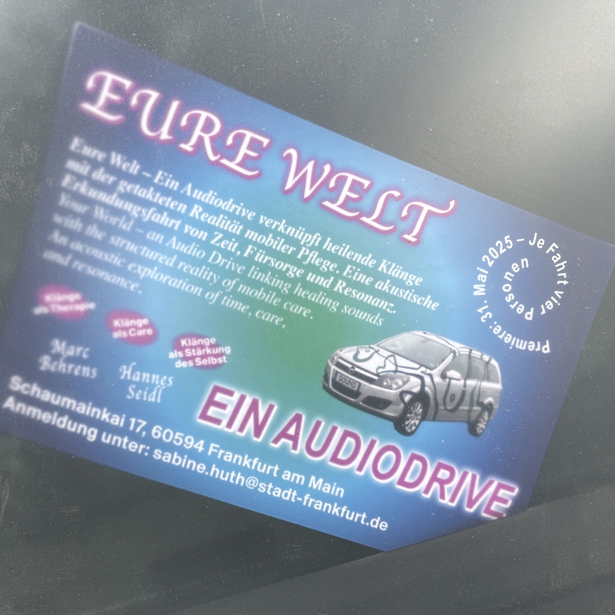 In Eure Welt [Your World], Marc Behrens and Hannes Seidl take the audience on a sonic journey through various sound systems of healing frequencies. Inside the car designed by the artists, the audience can take a seat in the back seat and experience the power of the sounds for themselves. While the sounds carefully envelop the audience, conversations with people from outpatient care and sound therapy build a bridge to the world beyond the windows.